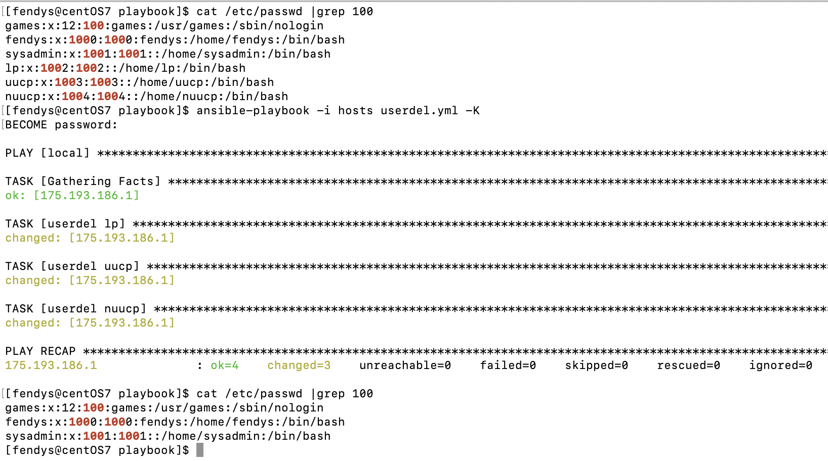명령 : ansible-playbook -i hosts userdel.yml -K